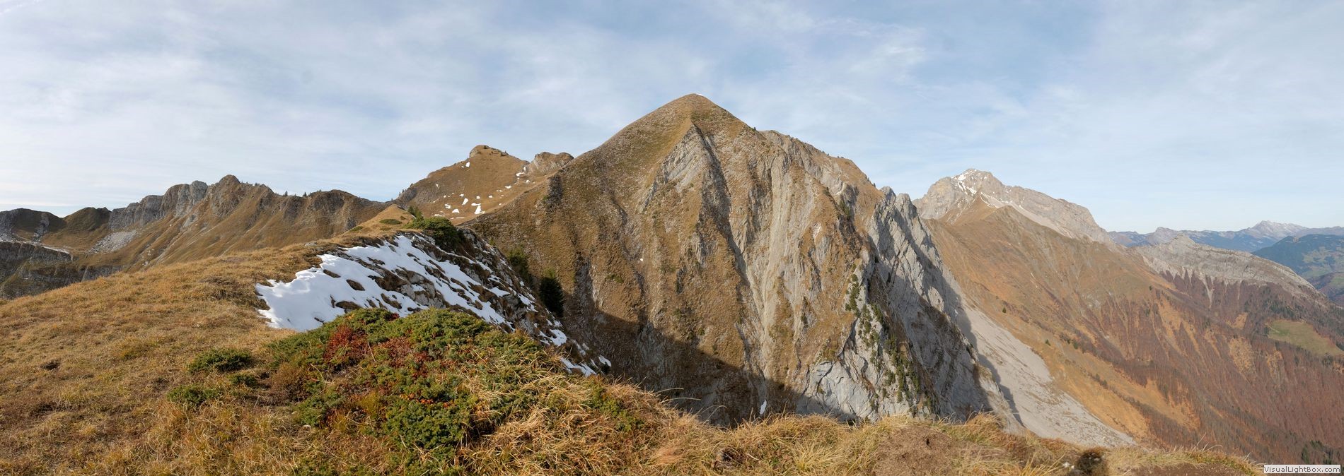L'itinéraire longe la Pointe de Chauriande sur la droite par un magnifique sentier jusqu'aux chalets d'Arclosan en suivant un balisage vert. De là il est possible de monter sur la crête à droite en passant par la Croix d'Arclosan. Mon choix s'est porté pour la boucle dans l'autre sens en montant tout droit jusquau col du Pas de la Mine, puis à la Pointe de Banc Fleury et ensuite au Crêt des Mouches à travers la superbe combe d'Arclosan afin d'avoir la vue sur les Aravis et le Mont-Blanc au retour par un superbe sentier en bordure de crêtes. Présence d'une vingtaine de bouquetins au pied du col du Pas de la Mine que j'ai pu approcher à une dizaine de mètres sans les inquiêter. il y avait aussi une dizaine de chamois sous le Crêt des Mouches. Panoramas fantastiques sur le lac d'Annecy et la Tournette depuis les 3 spots que sont le col du Pas de la Mine, la Pointe de Banc Fleury et le Crêt des Mouches. La descente par les crêtes jusqu'au chalets d'Arclosan offre des vues superbes sur le Charvin, le Mont-blanc et la Tournette. Des chalets d'Arclosan la descente se fait par le même itinéraire que celui emprunté à la montée. Randonnée splendide sans danger si elle a lieu dans de bonnes conditions. |