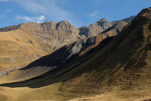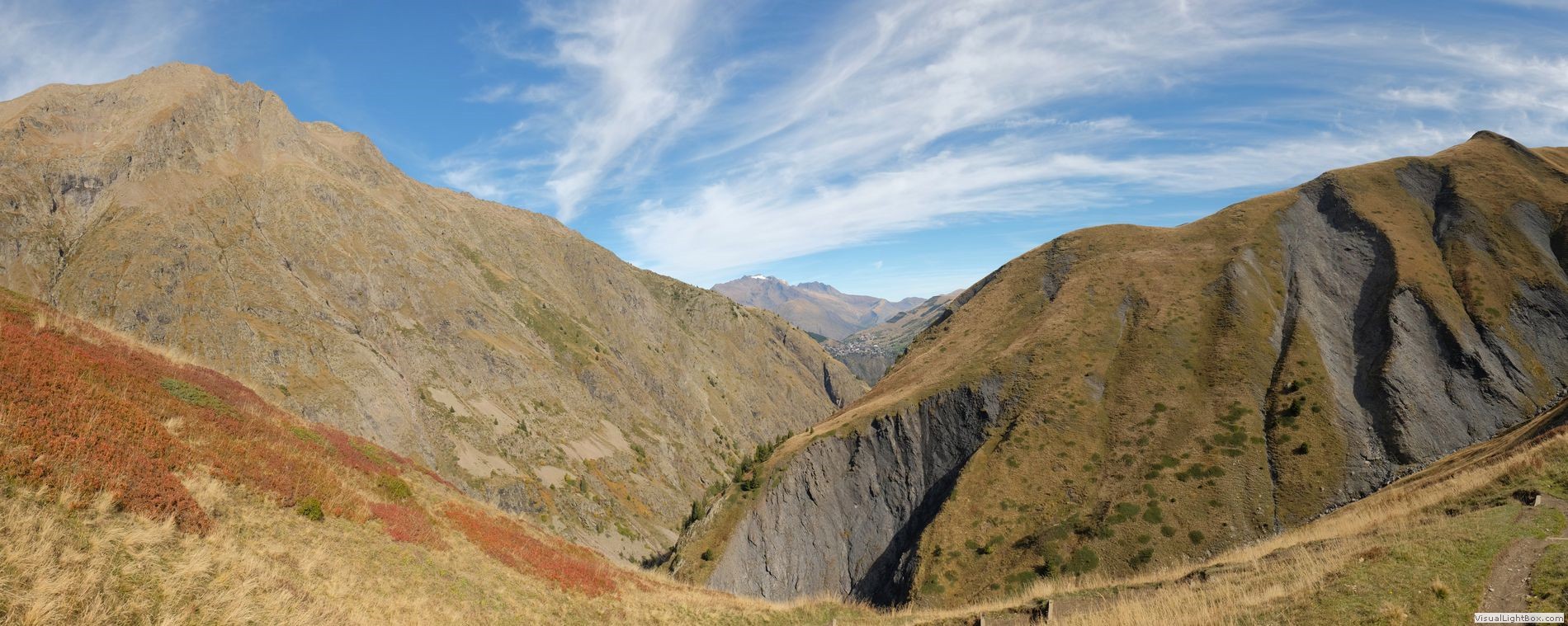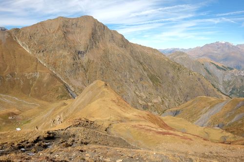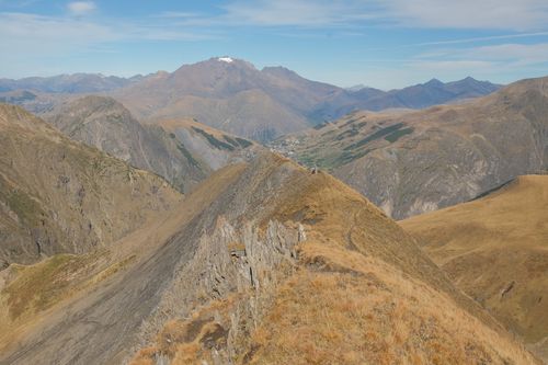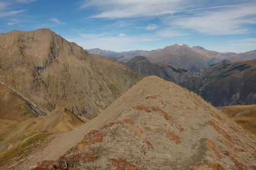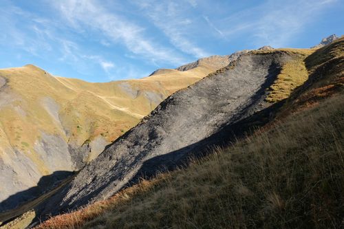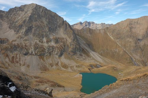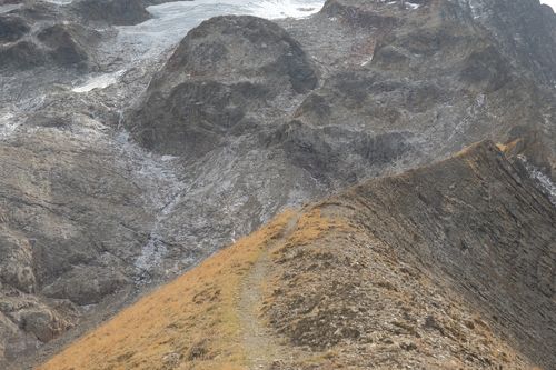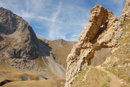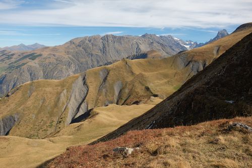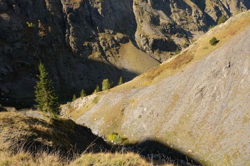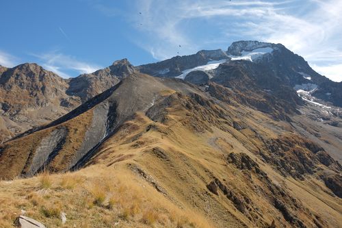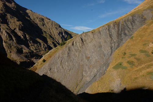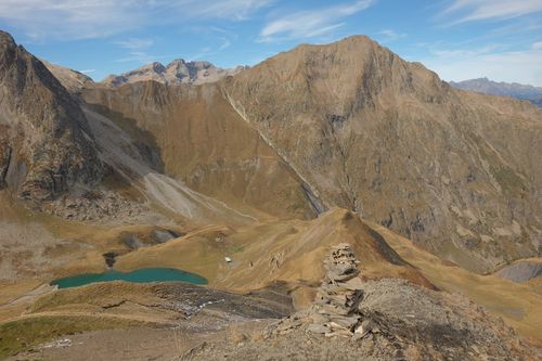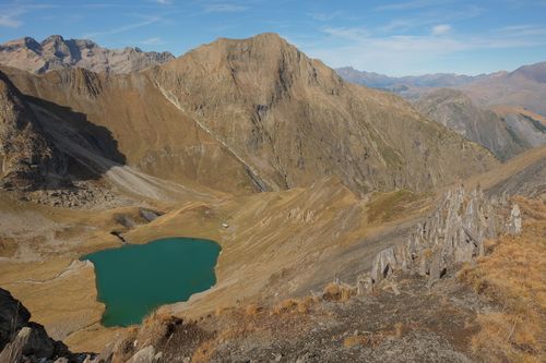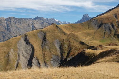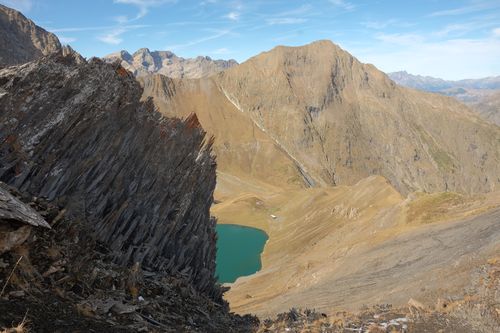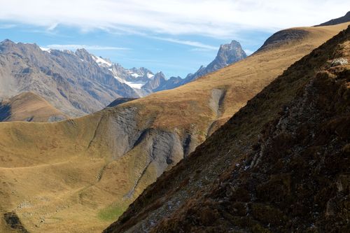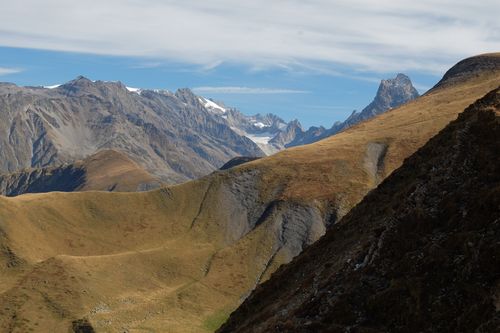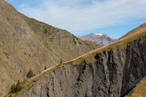 Mercredi 7 octobre 2025 — Retour dans le massif des Écrins pour une randonnée incontournable : le lac de la Muzelle, ses impressionnantes formations rocheuses, et la crête menant au belvédère de la Muzelle, au pied du glacier éponyme. Le départ s’effectue sur un sentier dallé, irrégulier et assez éprouvant, qui se radoucit avant d’atteindre le lieu-dit Le Cerisier (1 km). De là il faut compter environ 2 km à avant de déboucher sur le magnifique vallon de la Pisse et ses cascades, dominé par le verrou du Clot du Selat et la majestueuse Tête de la Muraillette. Par un agréable sentier on arrive au fond du vallon, où il faut franchir le ruisseau des Cabanes, puis emprunter à gauche un sentier en lacets qui grimpe raide au-dessus du ruisseau du Chapeaux Roux. La dernière portion est équipée de traverses en bois formant des marches. On atteint alors les Tourbières, un replat offrant une vue panoramique sur le Pic Blanc, les Deux Alpes, la Pointe de l’Olan et l’Aiguille de Venosc. Après deux minutes de marche, on parvient à un petit col surplombant le lac et le refuge de la Muzelle, situés à 2 112 m d’altitude, encadrés par des sommets remarquables : La Grande Roche de la Muzelle au sud, le col du Vallon et la Tête de la Muraillette à l’est. Depuis le col, ne pas descendre vers le lac mais repérer le mamelon sur la gauche, accessible par un sentier en gradins. Le panorama y est superbe. Ce sentier débouche sur la ligne de crête, permettant de rejoindre le sentier venant du lac au niveau de la très belle Roche Percée. On progresse ensuite en passant devant la Cheminée de fée, puis par une série de lacets surplombant le lac, on atteint une dernière bosse marquée par un cairn. La ligne de crête permet d'atteindre le belvédère au pied du Glacier de la Muzelle. Du sommet, la vue est splendide : le lac de la Muzelle aux eaux émeraudes, la Grande Roche de la Muzelle et son glacier tout proche, le Pic du Clapier Peyron, le col de la Muzelle, la Tête de la Muraillette, le col du Vallon et l’Aiguille de Venosc. À la descente, il faut repérer la magnifique arche naturelle de la cheminée de fée invisible à la montée, tout en bas de la ligne de crête. De là reprendre le sentier en passant à gauche de l'arche en direction du lac pour une pause bien méritée avant d’entamer la longue descente vers le parking. Une très belle randonnée exigeante, avec une descente interminable dont la dernière portion, sur sentier dallé, est particulièrement éprouvante. Heureusement, la beauté des lieux compense largement les efforts demandés. Du lac de la Muzelle en plus de monter au belvédère d'autres options sont possibles : Le col de la Muzelle au sud du lac, pour un dénivelé de 500m et le col du Vallon à l'Ouest, liaison entre le lac de la Muzelle et le Lac Lauvitel pour un dénivelé d'environ 420m |